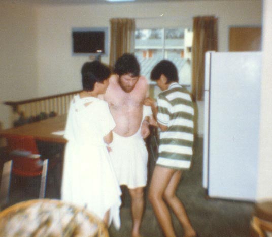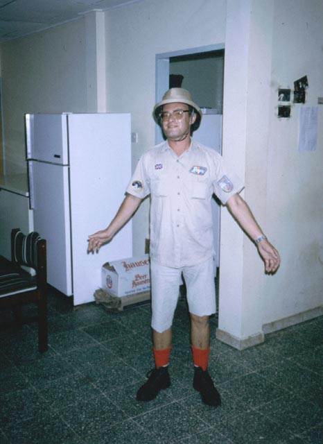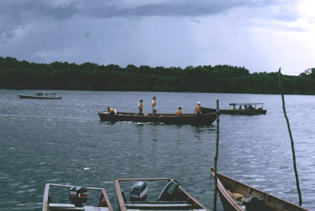 Shooting across the Belait River. Jim Plaice and Dave Jones (Bird-dog) site-seeing.