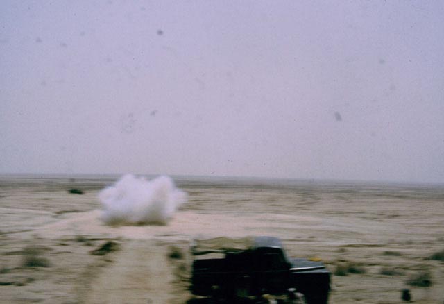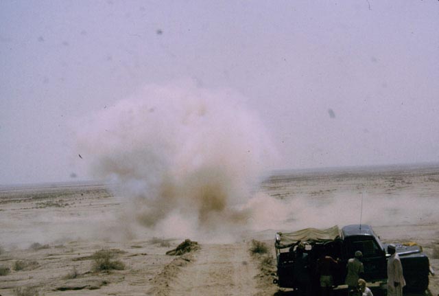 This was an above ground dynamite test. I went along for the photo opportunity but it didn't work out very well. 10 two metre poles with 2kg of dynamite attached to each made quite a blast and instead of getting the photograph of the century I was thrown into the back of the pickup that I was sheltering in. I had the camera propped up on the cab with the pickup pointing down the hill. You can make out the shooters crouching behind the other pickup.